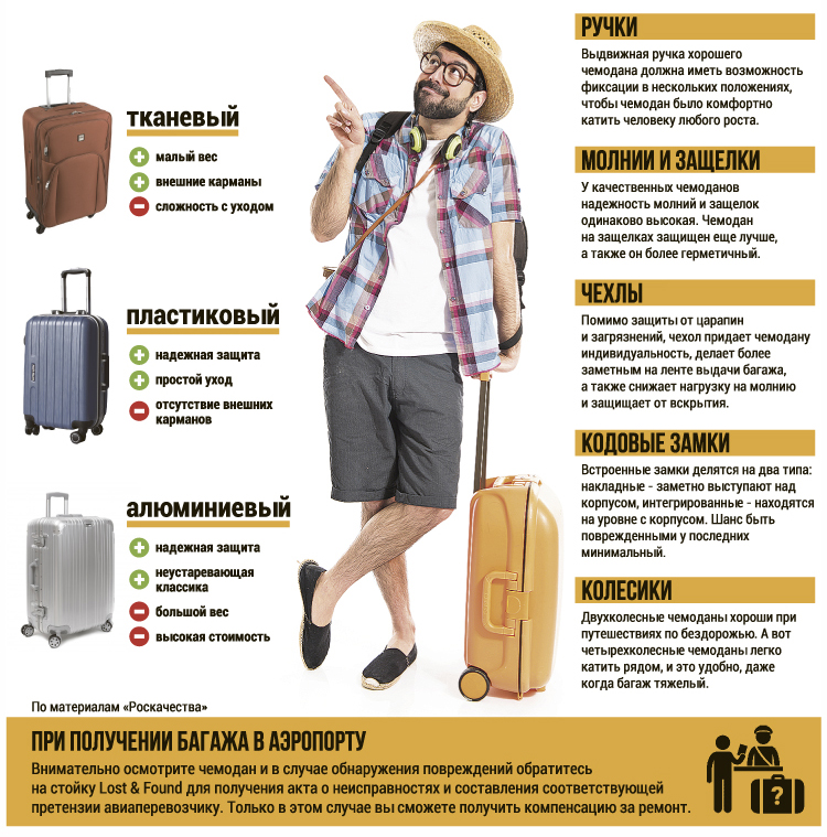 Как правильно выбрать чемодан? Чемодан очень влияет на ваш комфорт в поездке и на простоту или сложность его упаковки, поэтому, когда вы пойдете в магазин за чемоданом, имейте в виду следующее: Не вовремя сломанная молния на чемодане может существенно усложнить процесс сбора. Поэтому при покупке доверяйте проверенным брендам с хорошей репутацией и твердыми гарантиями качества. Выбирайте легкий чемодан. Тут одни только плюсы: его и таскать будет легче, а если вы собираетесь лететь на самолете, вам не придется дополнительно платить в аэропорту за тяжелый багаж. Жесткий односторонний чемодан хорошо защищает ваши вещи от повреждения, но он, как правило, весит больше и его труднее втиснуть в узкое пространство, кроме того, труднее упаковать в него вещи. Если ваши вещи не нуждается в дополнительной защите, берите легкий чемодан с мягкими стенками.